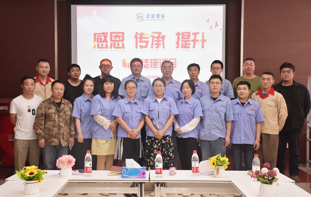 九月之初,桃李芬芳。在這片充滿深情的黑土地上,到處都是中辰人忙碌的身影,在廠區、橋梁、産業園,中辰人于細微處展現爐火純青的技藝;看設計、焊接、澆築,中辰人在電與火之間傳遞精益求精的匠心。時代發展,企業前行,都離不開傳承,恰逢教師節來臨之際,中辰鋼構于9月9日下午,在公司一樓職工之家召開了以“感恩 傳承 提升”為主題的師徒座談會,10餘名新入職的員工與他們的師傅共坐一堂,笃揮胸墨,薪火相傳。