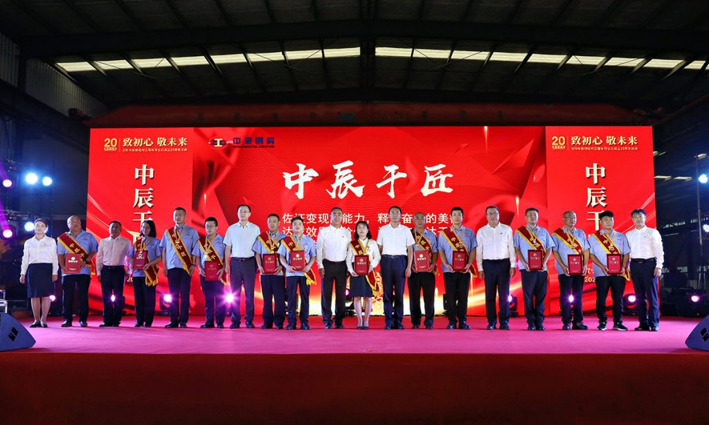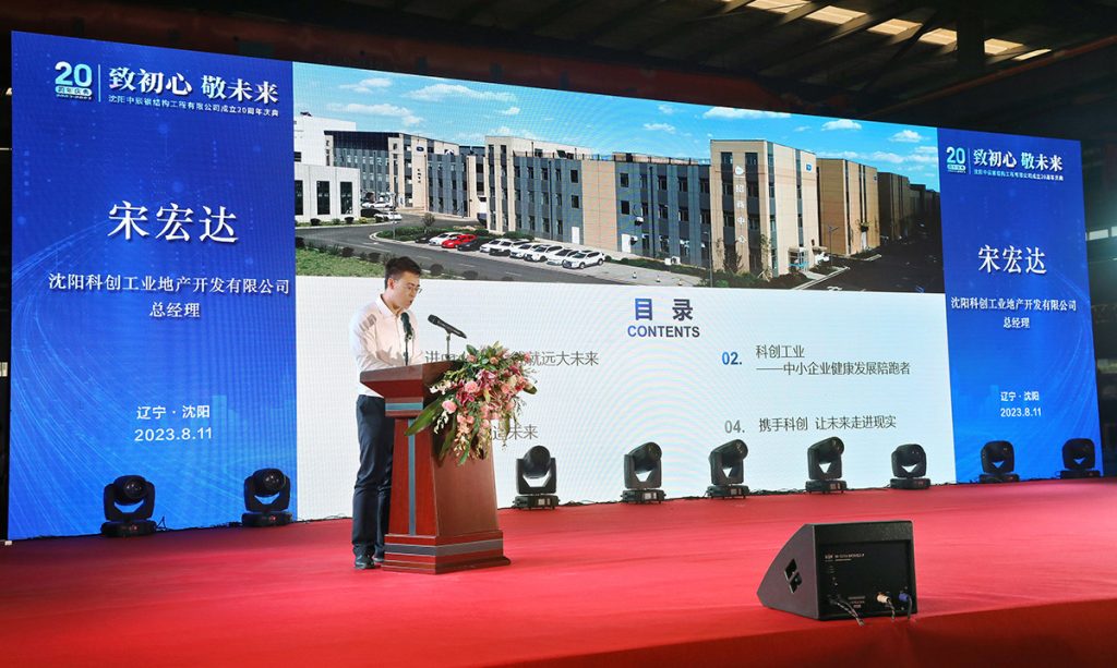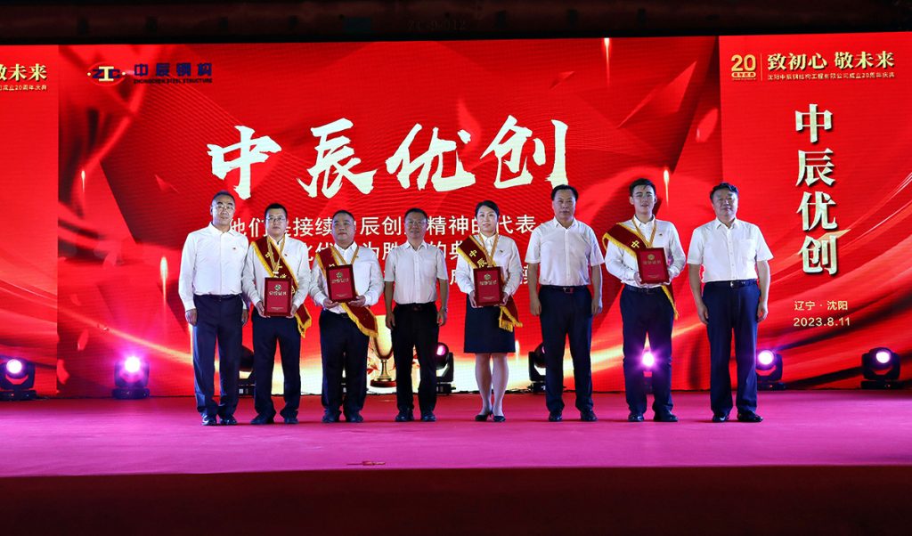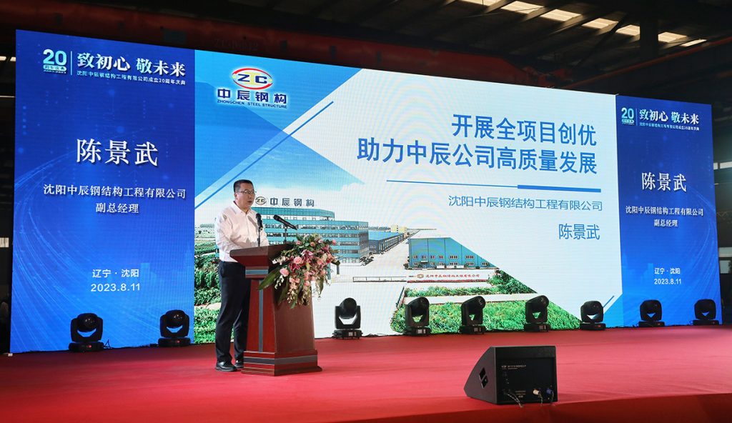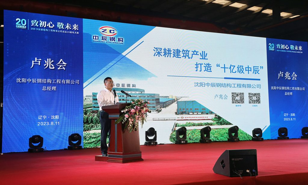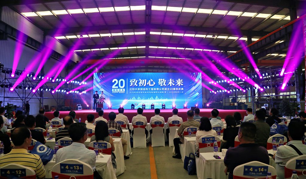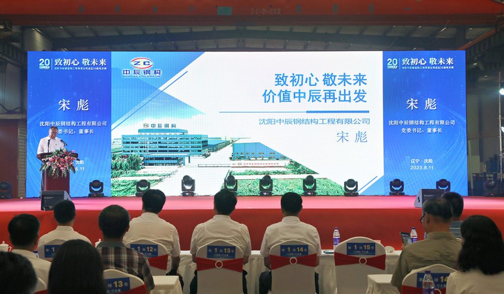 2023年8月11日,中辰鋼構“緻初心 敬未來”成立二十周年慶典活動在中辰鋼構2号廠房隆重召開。遼甯省人大環境資源城鄉建設委員會副主任委員董峰、沈陽市鐵西區委副書記,區政府黨組書記、區長,經開區、中德園黨工委副書記、管委會主任趙永聖等省市領導出席會議和表彰,300餘名合作夥伴與300餘名中辰員工共同慶賀中辰鋼構成立二十周年。